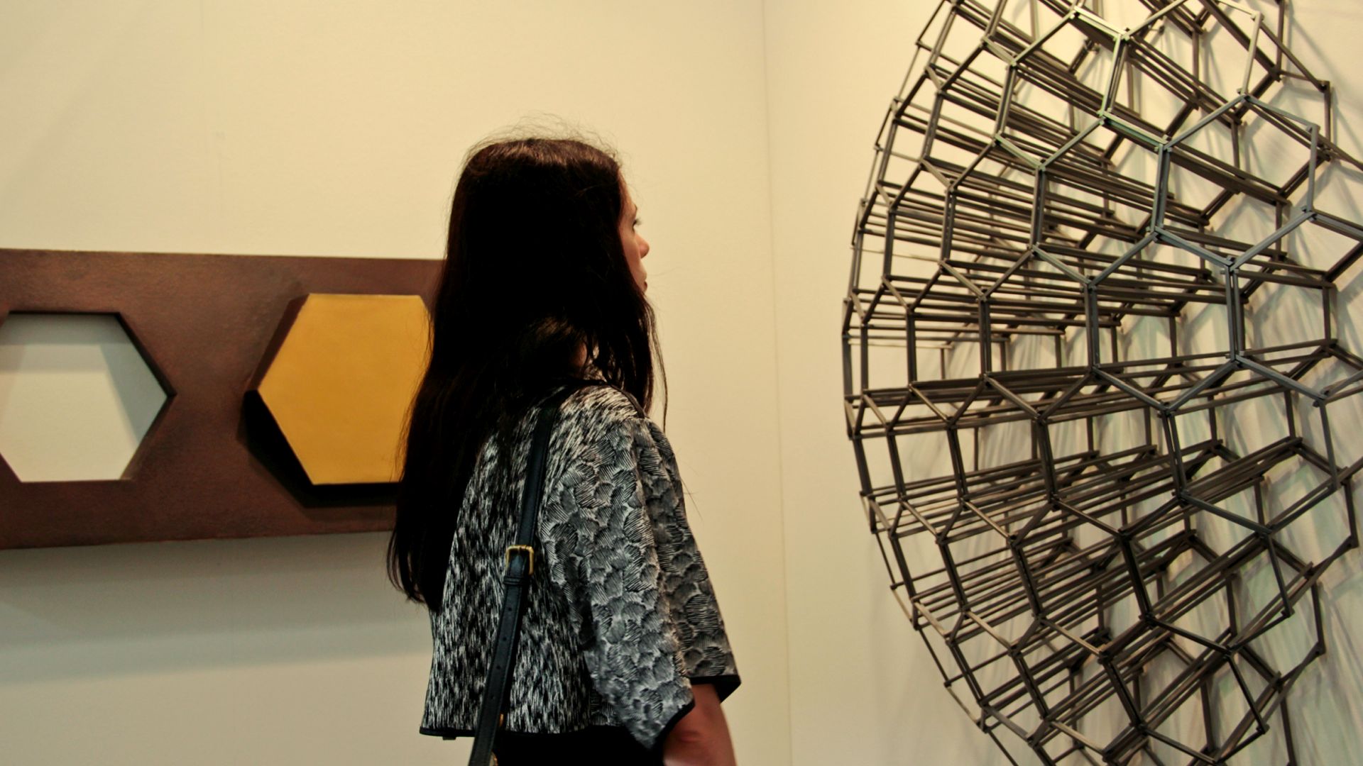 una sfilata serale di Lucca fashion weekend, In primo piano unamodella con un abito drappeggiato e una borsa etnica illuminata da una luce colorata.