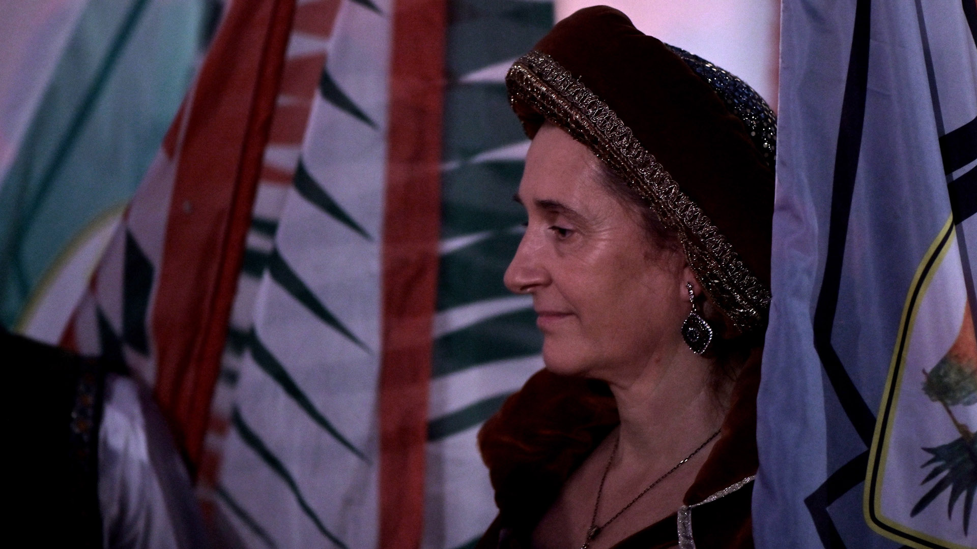uno sbandieratore si nota appena in mezzo allo sventolare di bandiere che sta manovrando