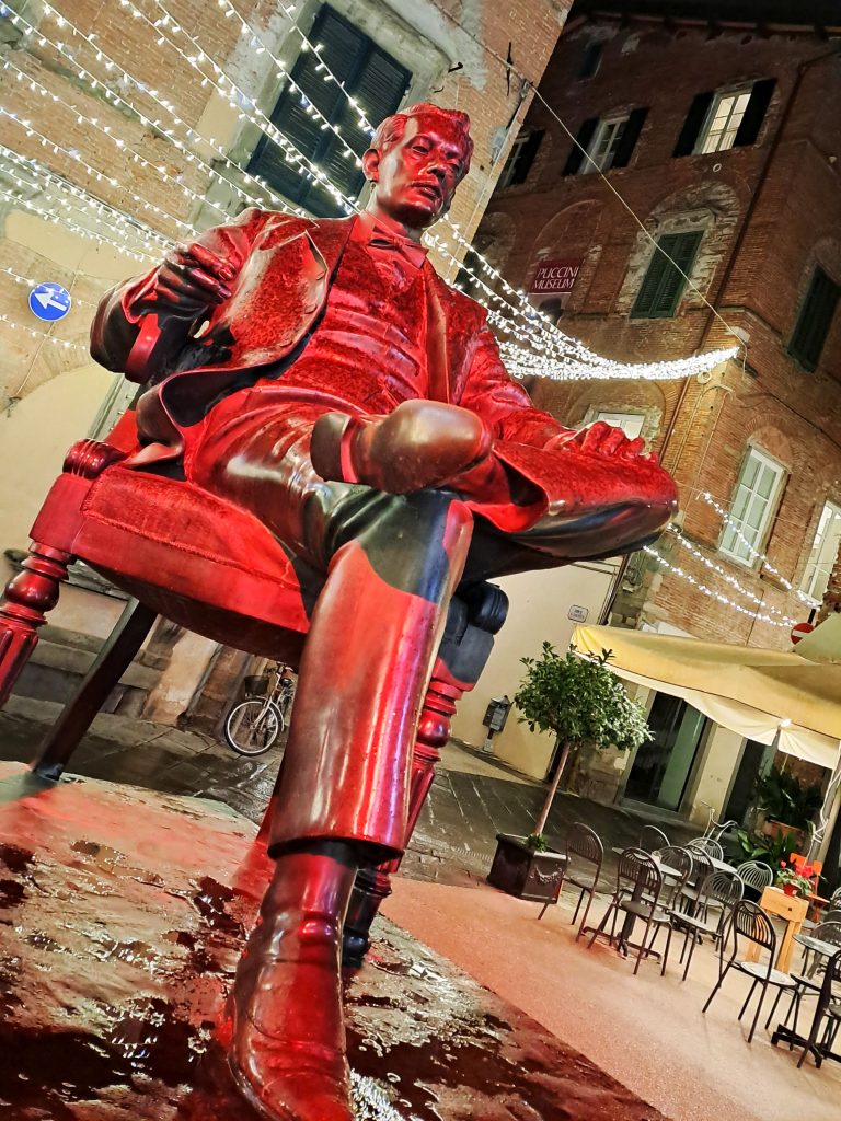 - in piazza del Teatro del Giglio Giacomo Puccini con il cielo di stelle